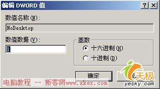 4.双击值“NoDesktop”,在“编辑DWORD值”对话框中将“数值数据”设置为1,如图2所示,并单击“确定”按钮。
