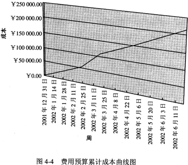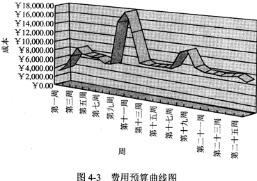 时间以月为单位表示在图的下方,主要活动从上到下列在图的左边。计划需要确定书的出版包括哪些活动,这些活动的顺序,以及每项活动持续的时间。时间框里的线条表示计划的活动顺序,空白的现况表示活动的实际进度。甘特图作为一种控制工具,帮助管理者发现实际进度偏离计划的情况。在本案例中,除了打印长条校样以外,其他活动都是按计划完成的。在费用预算方面,如按时间坐标来分析,有两种表现方式:一是费用预算曲线图,二是费用预算累计曲线图。图4-3和图4-4为Project 2000绘制的费用预算曲线图和费用预算累计成本曲线图。