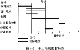 甘特图(Gantt chart)是在20世纪初由亨利·甘特开发的。它基本上是一种线条图,横轴表示时间,纵轴表示要安排的活动,线条表示在整个期间上计划的和实际的活动完成情况。甘特图直观地表明任务计划在什么时候进行,以及实际进展与计划要求的对比。图4-2是一个手工绘制的图书出版项目甘特图。
