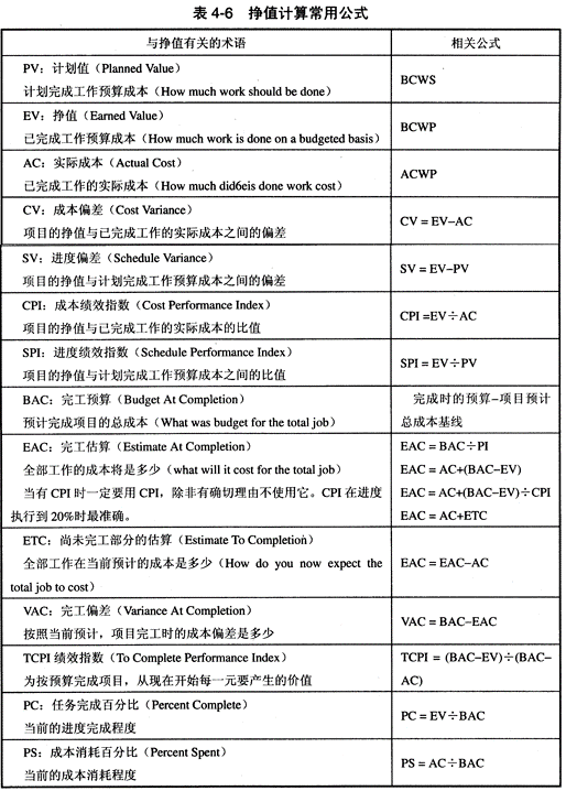 (l0)完工估算EAC (Estimate At Completion),反映了根据项目的进展总成本是多少,如表4-6所示。