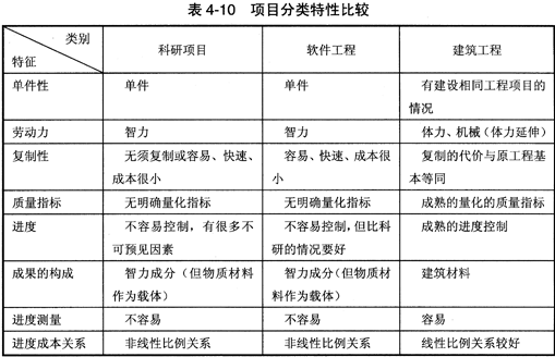 本题的主要考点在于怎样在软件开发项目中合理、有效地进行挣值管理。要合理使用挣值管理方法,必须同时考虑到软件工程项目的特点。软件工程项目与建筑工程项目有很大的区别。软件工程项目更加类似于科研项目。如表4-10所示。