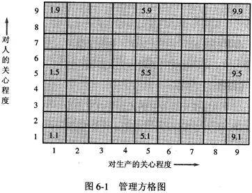 管理方格图(图6-1)中,1.1定向表示贫乏的管理,对生产和人的关心程度都很小;9.1定向表示任务管理,重点抓生产任务,不大注意人的因素;1.9定向表示所谓俱乐部式管理,重点在于关心人,企业充满轻松友好气氛,不大关心生产任务;5.5定向表示中间式或不上不下式管理,既不偏重于关心生产,也不偏重于关心人,完成任务不突出;9.9定向表示理想型管理,对生产和对人都很关心,能使组织的目标和个人的需求最理想、最有效地结合起来。