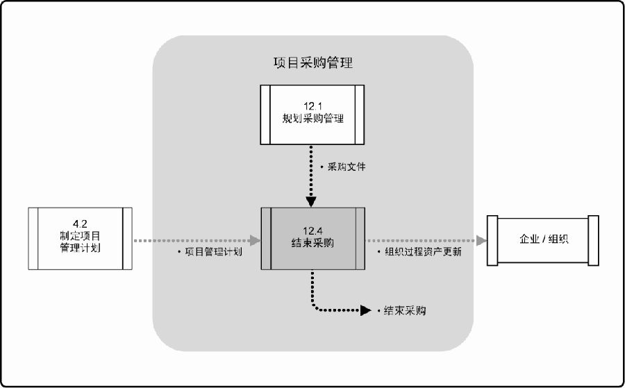 结束采购是完结单次项目采购的过程。本过程的主要作用是,把合同和相关文件归档以备将来参考。图12-8描述本过程的输入、工具与技术和输出,图12-9是本过程的数据流向图。