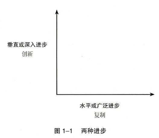 我们期待的未来足进步的。进步可以呈两种形式。第一,水平进步,也称广泛进步,意思是照搬已取得成就的经验——直接从1跨越到n。水平进步很容易想象,因为我们已经知道了它是什么样。第二,垂直进步,也称深入进步,意思是要探索新的道路——从0到1的进步。垂直进步较难想象,人们需要尝试从未做过的事。如果你根据一台打字机造出了100台打字机,那就是水平进步。而如果你有一台打字机,又造出了一台文字处理器,那你就取得了垂直进步。