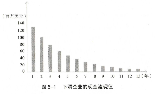 简单地说,一个企业今天的价值是它以后创造利润的总和。(正确估价一家企业,还要把未来现金流折算成今天的价值,因为相同额度的资金现值要比期值更有价值。)通过比较现金流现值,我们能看出低增长企业和高增长的初创公司的明显区别。一家老公司(如报纸公司)如果能维持目前的现金流五六年,就可以保持自己的价值。但是任何公司在与同等实力的竞争者竞争时都会造成利润流失。夜总会和餐馆就是典型的例子:成功者今天可能收入不菲,但是现金流可能会在几年之内减少,因为顾客总会选择更新更潮的地方去消费。