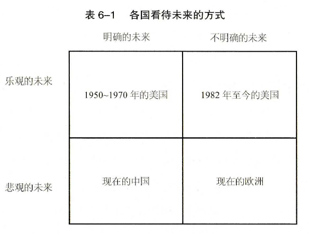 一个对未来明确的悲观丰义者相信未来是可知的,但却是暗淡的,所以他必须提前做好准备。也许当今的中国是最典型的对未来明确的悲观主义者。美国人看见中国的经济迅猛增长(自从2000年以来,每年都有10%的增长),便认为中国是一个自信能够掌握自己未来的国家。但这是因为美国人仍然很乐观,并以同样的乐观看待中国。从中国的角度来看,经济增长得还不够快。其他国家都害怕中国将要统治整个世界,而中国是唯一一个认为自己不会统治世界的国家。