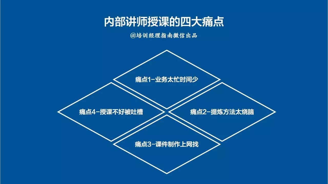 痛点1:提炼方法太烧脑,如果要讲好课,内训师必须将自己的经验提炼为结构性的知识,从定位问题,到总结解决问题的方法,这是一个痛苦的烧脑过程,很多内训师这一关都没有过,那么培训经理你准备如何解决这个痛点?