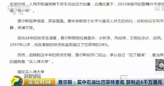 查尔斯说,剩下的那一半中石油仓位他一直没卖,现在还有,因为依然看好。问及收益如何,查尔斯告诉我们,这只票拿了十几年,期间进进出出,具体收益没有仔细核算过,但仅在中石油上的收益近6千万港元。