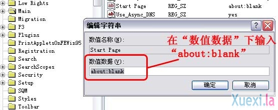 | 2、在打开的注册表编辑器左边文件夹列表中依次找到 HKEY_CURRENT_USER\Software\Microsoft\ Internet Explorer\Main,然后在右边的窗口中找到文件名为“Start Page”的文件双击打开,将“数值数据”里的内容清空并输入“about:blank”,点击“确定”按钮: |