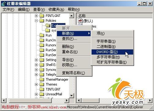 3.在“Explorer”子键上单击右键,并从弹出菜单中选择“新建|DWORD值”,如图1所示,然后将新值的名称改为“NoDesktop”。