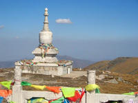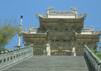 从龙泉寺对面的公路盘升,经过九拐十八回,就可望到一处南台之北,中台之南的金阁寺了。除五座台顶的寺庙建筑外,金阁寺所处的地势最高,海拔1900多米,距台怀镇15公里。