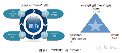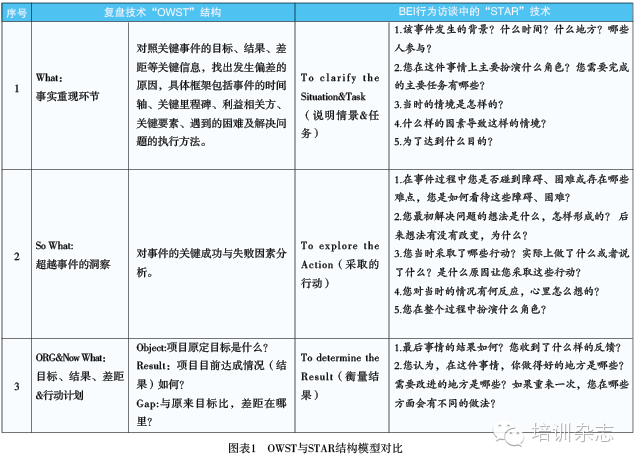 依托培训与发展中心对“复盘技术”的大力推广,人力资源部负责人章军总提出了“如何将复盘技术有效运用于人才测评”的命题。而“复盘技术”中的“OWST”的结构与BEI行为访谈中的核心技术“STAR”,在分析关键行为、了解思维程序和解决模式上多维度的契合性(见图表1)。