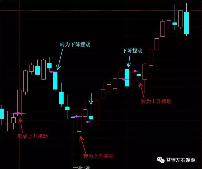 先给定义:k线的最高点比前一根k线最高点高,最低点也比前一根k线最低点高的状态就是上升摆动;k线最高点比前一根k线最高点低,最低点比前一根k线最低点低的状态就是下降摆动。